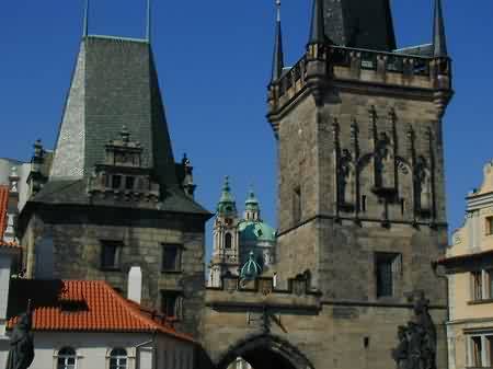 Věže stojí na levém břehu Vltavy a ústí do nich Karlův most. Menší z věží je románského původu a pochází z 3. čtvrtiny 12. stolení. Patřila k opevnění Juditina mostu. V 16. století zde byla celnice. Vstup do věže je z chodby domu čp. 56. Věž má tři patra spojená dřevěným schodištěm, v posledním patře je vchod na oblouk brány a dá se tak přejít do druhé věže. Malostranská brána je postavena v gotickém slohu, má tvar rovnoběžných hrotitých arkád. Zdobí ji cimbuří, znaky zemí, které patřily Václavu IV. a znak Starého města pražského. Nejmladší stavební částí mostu je vyšší z mosteckých věží. Byla postavena v druhé polovině 15. století králem Jiřím z Poděbrad. Má hranolový tvar a svým vzhledem navazuje na Staroměstskou mosteckou věž. Její ochoz je v sezóně (duben – říjen) přístupný veřejnosti.