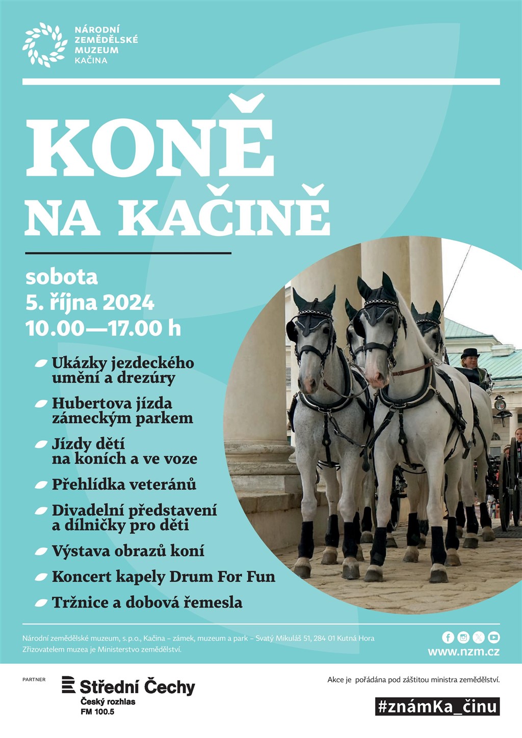 V sobotu 5. října 2024 se konají na zámku Kačina u Kutné Hory oblíbené slavnosti věnované koním. Během dne se představí různá plemena koní, včetně starokladrubských koní a koní Kinských. K vidění budou ukázky práce v zápřahu a tahu i přehlídky jezdeckého umění. Vyvrcholením bude Huberova jízda zámeckým parkem, která jako připomínka parforsních honů tradičně ukončuje jezdeckou sezónu. Od deseti do sedmnácti hodin na návštěvníky čeká bohatý kulturní a doprovodný program, divadlo, kolotoč a tvořivé dílny pro děti. K tomu samozřejmě možnost projížděk na koních pro děti i dospělé.